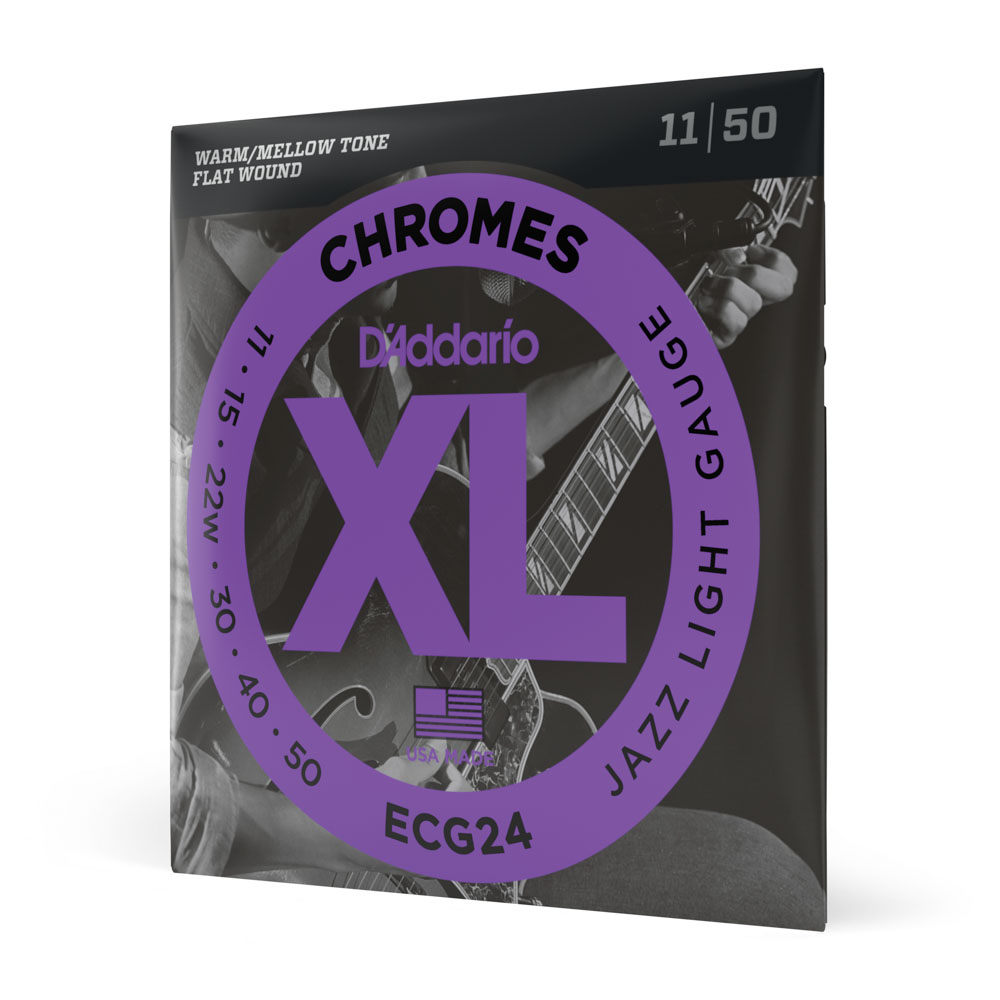 As cordas D Addario Chromes Flat Wound são as cordas "flat mais famosas do mundo, devido a seu toque macio, cobertura lisa e excelente sonoridade. Após o enrolamento, cada corda recebe 3 etapas de polimento, resultando numa superfície macia que faz das cordas Chromes a escolha ideal dos guitarristas de jazz e fusion. O timbre quente é ideal para o jazz, rockabilly e R&B.
